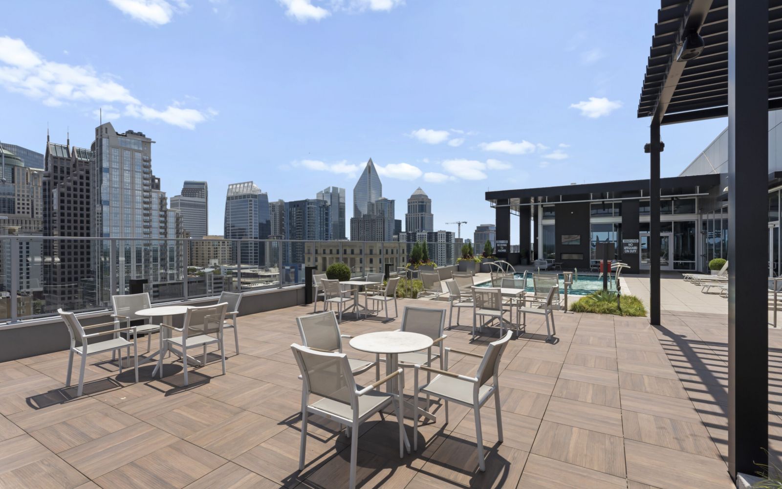 - Two sparkling pools (including a rooftop lounge with skyline views of Uptown and the stadium).